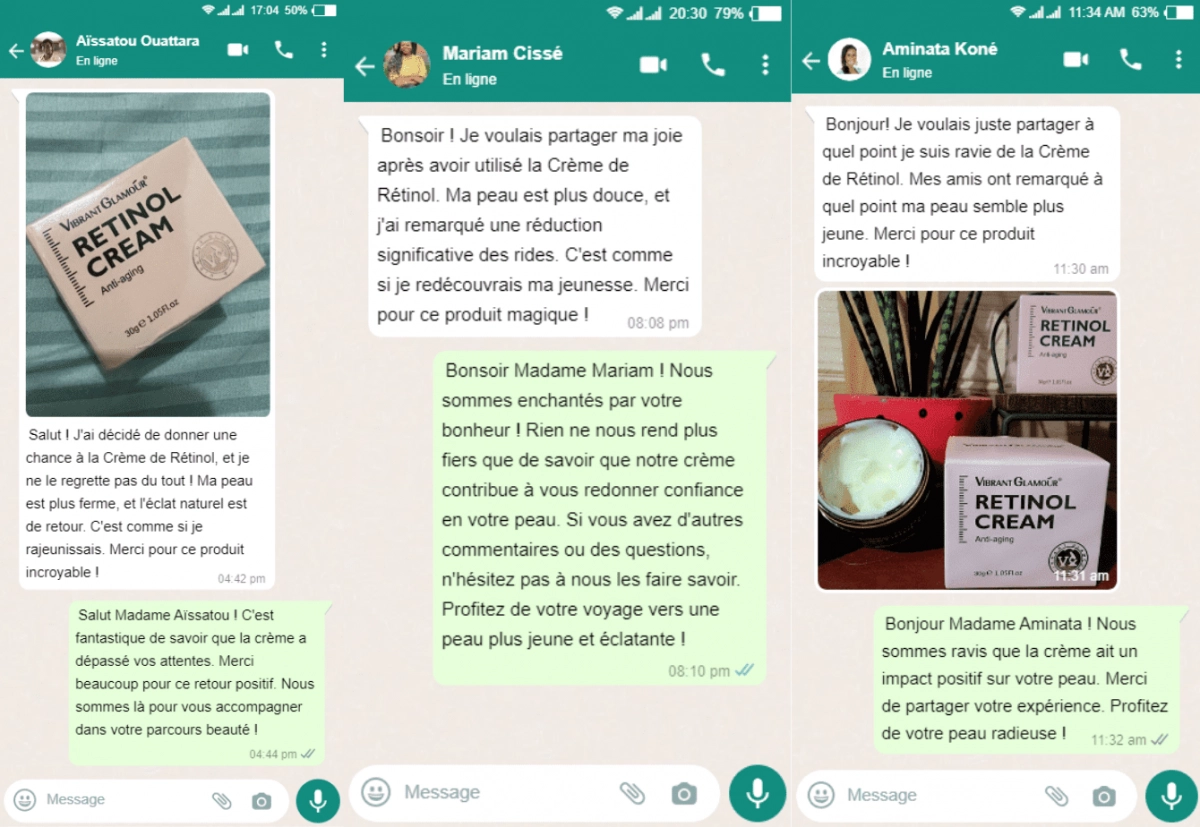 Notre Crème de Rétinol est enrichie en une combinaison puissante de rétinol, de vitamine C, d'acetyl hexapeptide-8 et d'arbutin. Elle combat efficacement les rides et les fines lignes, tout en favorisant la production de collagène pour une  peau plus ferme. Les photos avant/après de clients satisfaits témoignent des résultats incroyables.